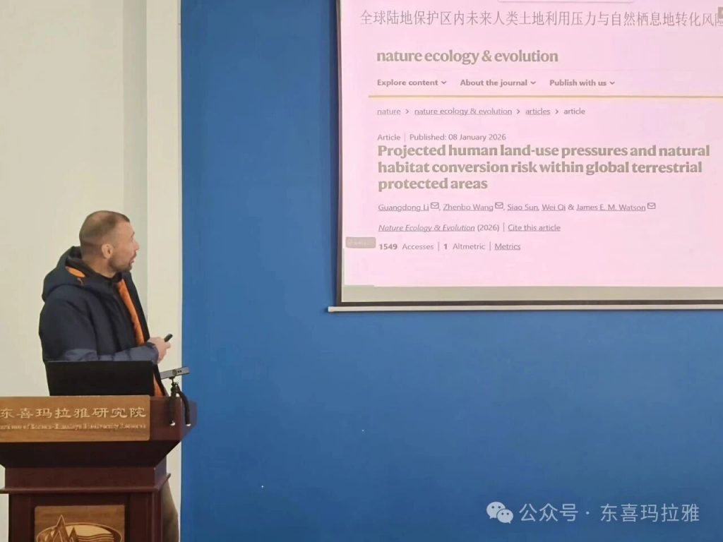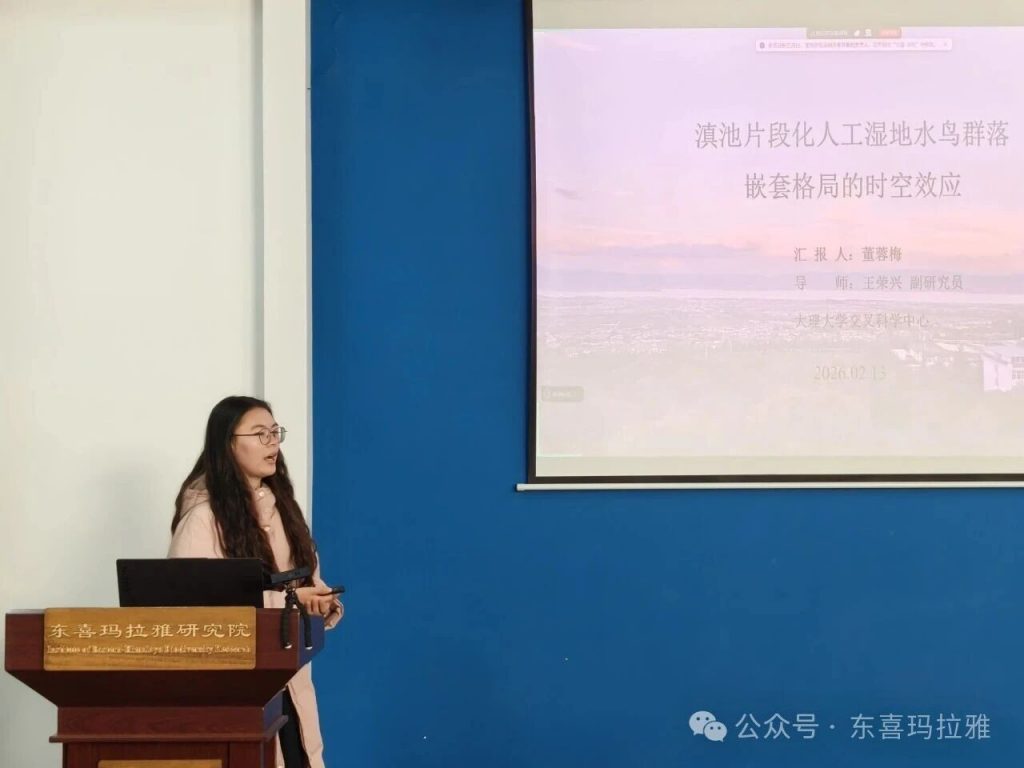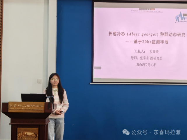 会议上,研究生张明靖、董蓉梅、万嘉敏和老师福大伟分别做了《野马如何守护“家庭边界”?——非领地性动物的空间策略:基于无人机观测的野马多层社会研究》《滇池片段化人工湿地水鸟群落嵌套格局的时空效应》《长苞冷杉(Abies georgei)种群动态研究——基于20ha监测样地》及《Projected human land-use pressures and natural habitat conversion risk within global terrestrial protected area(全球陆地保护区内人类土地利用压力与自然栖息地转换风险的预测)》的报告。