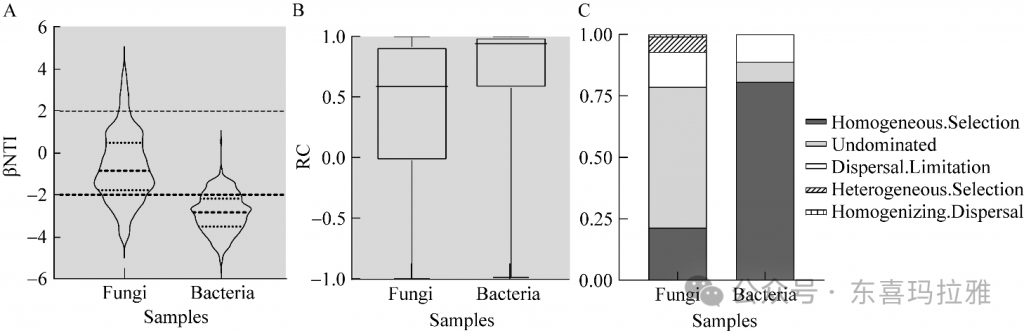 叶际真菌与细菌的群落构建过程:微生物类群是叶际微生物群落构建过程中的主导因素。细菌群落的构建主要以确定性过程的同质选择为主导,而真菌群落的构建则主要受随机性过程的生态漂变影响。