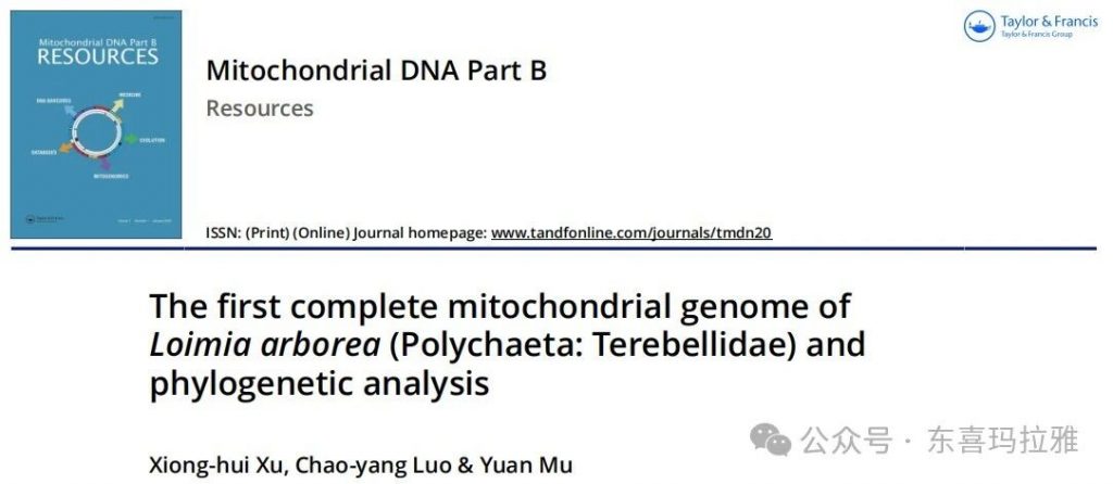 该研究成果于2024年11月8日以The first complete mitochondrial genome of Loimia arborea(Polychaeta:Terebellidae)and phylogenetic analysis为题,发表在SCI期刊Mitochondrial DNA Part B上。第一作者本科生许雄惠在大理大学东喜玛拉雅研究院沐远老师的指导下完成,并获得了本科生罗朝洋的协助。该研究得到大理大学高层次人才引进启动项目(KY1916101940)和云南省高校洱海流域生态环境质量检测工程研究中心(DXDGCZX03)项目的支持。