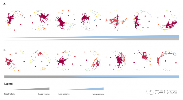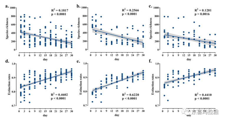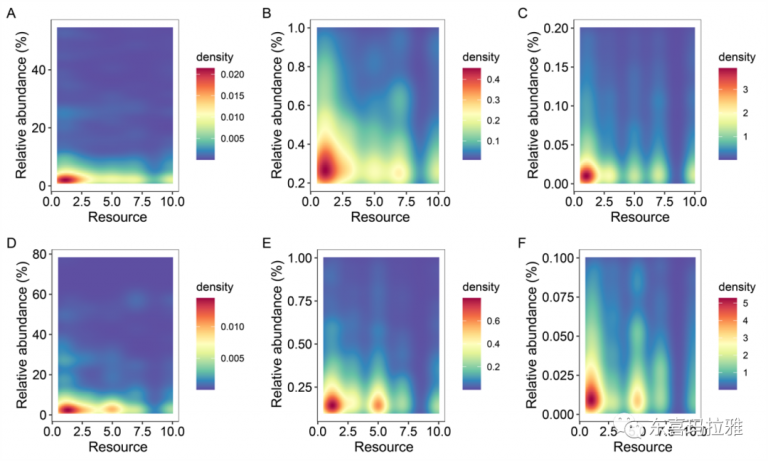 为了应对这些挑战并验证这一假设,本研究创建了两套资源和体积呈正相关和负相关的微生物微宇宙实验系统。连续30天,11个时间点的157个高通量测序结果表明,更多资源并不能塑造更高的微生物种群密度;微宇宙体系中灭绝率与资源或体积均未出现负相关关系;无论是资源总量与微宇宙体积呈正相关还是负相关的实验组均未出现显著的SAR;资源也并未改变微生物互作网络的结构和复杂度。有研究者认为生境资源总量越多将吸引更多昆虫个体迁入。本实验中,完全独立密闭的微宇宙体系排除了扩散的作用,因此若资源集中假说确实能够塑造SAR则扩散才是其主要机制。