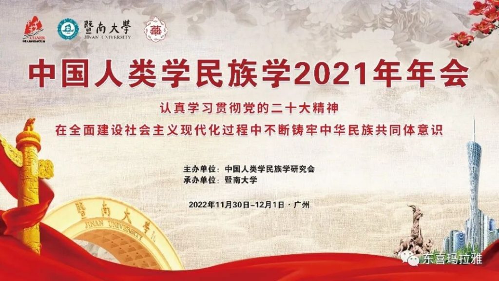 2022年11月30日至12月1日,由中国人类学民族学研究会主办,暨南大学承办的中国人类学民族学年会以线上方式召开。本次年会的主题是“认真学习贯彻党的二十大精神,在全面建设社会主义现代化国家过程中不断铸牢中华民族共同体意识”。来自北京大学、清华大学、中央民族大学、中国社会科学院民族学与人类学研究所、中山大学、云南大学、浙江大学、大理大学等80多所高校、科研院所的500多名专家学者参加会议。