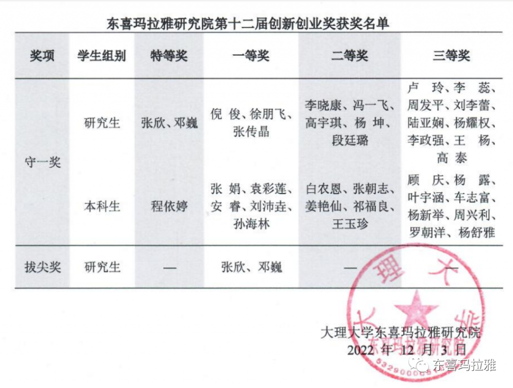 根据《东喜玛拉雅研究院创新创业奖评审制度》,东喜玛拉雅实践创新群管理委员会邀请 6 位老师和 3 位学生作为代表,组建了第十二届创新创业奖评审委员会,并于 2022年12月2日 在 S3-507 进行评审(考核期:2022年5月—2022年10月)。基于客观公正的原则,从申请者的工作状态、守一精神、对实创及研究院的融入和贡献等综合表现,共评出 38 人次获得本届创新创业奖。其中,守一奖特等奖 3 名、守一奖一等奖 8 名、守一奖二等奖 10 名、守一奖三等奖 17 名。此外,拔尖奖一等奖 2 名。