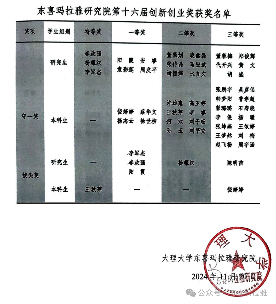 根据《大理大学实践创新群创新创业奖管理制度》,大理大学实践创新群管理委员会邀请6位老师和3位学生作为代表,组建了第十六届创新创业奖评审委员会,并于2024年11月19日在S3-507进行评审(考核期:2024年5月-2024年10月)。基于客观公正的原则,从申请者的工作状态、守一精神、对实创及研究院的融入和贡献等综合表现,共评出50人次获得本届创新创业奖。其中,守一奖特等奖3名、守一奖一等奖8名、守一奖二等奖14名、守一奖三等奖19名;拔尖奖特等奖1名,拔尖奖一等奖3名,拔尖奖二等奖1名,拔尖奖三等奖2名。
