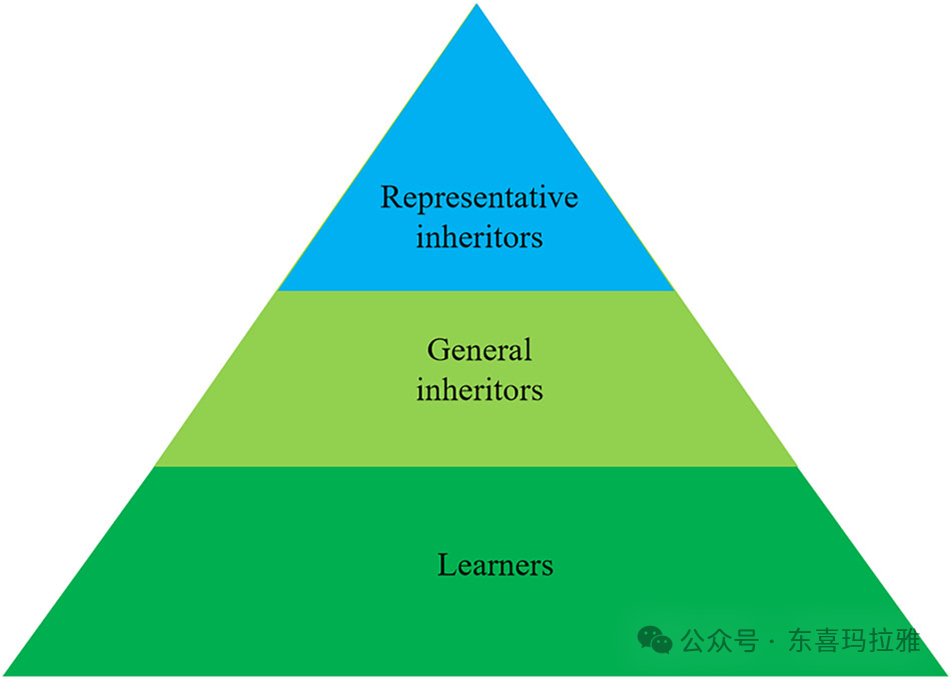 Figure 1 The relationship diagram of representative inheritors, general inheritors, and learners. 健全的非遗传承体系应当呈现金字塔结构:基座是数量庞大的学习者群体,顶端是精干有力的代表性传承人队伍。