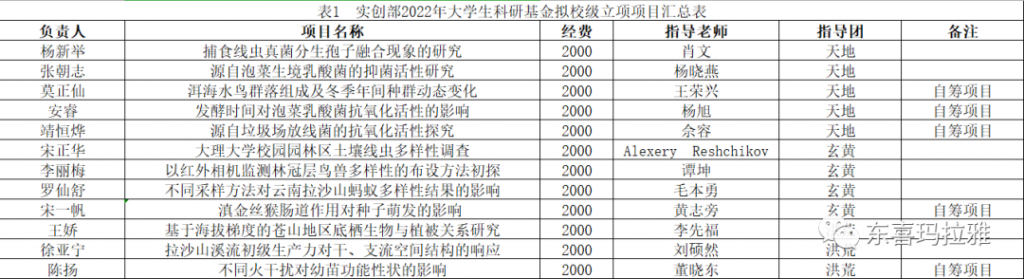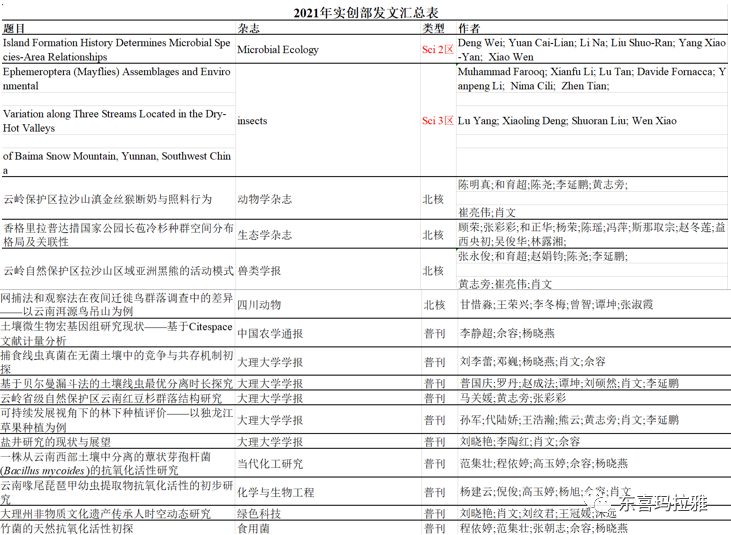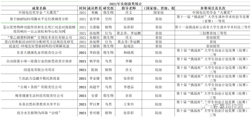 站在2022年的年初,再回首东喜玛拉雅研究院(以下简称东喜院)这一年的工作历程,在全体老师同学的共同努力下,我们研究院共产出57篇毕业论文,其中12篇优秀毕业论文;共发表17篇文章:其中有3篇sci,4篇中文核心,以及10篇普刊;在2021年大学生创新创业训练项目中,共有3个项目被评为国家级项目,其中16个项目被评为省级项目,2个项目被评为校级项目;并在第十一届“挑战杯”大学生课外学术科技节竞赛中,共有6个项目进入省级竞赛;成功申请了5项研究生类研究基金项目和12项大学生科研基金;在第九届“挑战杯”大学生课外学术科技节竞赛中,共有8个项目被评为院级三等奖;东喜院不仅注重学生的科研素养,更注重人才的素质培养!我院在中国电信奖学金中,有1人荣获“天翼奖”。此外,大学生科技协会圆满举办了6个二课活动,分别是第十七届社团博览会大学生科技协会风采展示、野外目测数据估计大赛、酸奶品鉴、野生保护动物卡通形象设计大赛、老照片收集和合作行为探究志愿者招募活动;大学生观鸟协会共举办了4个活动,分别是鸟类铭牌模板设计大赛、野外观鸟培训主题讲座、第十七届社团博览会大理大学观鸟协会风采展示和云南野生动物科普讲解大赛。