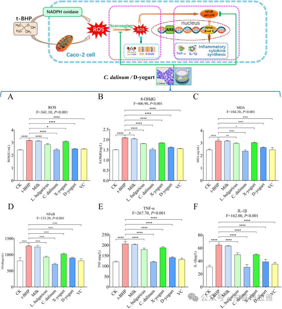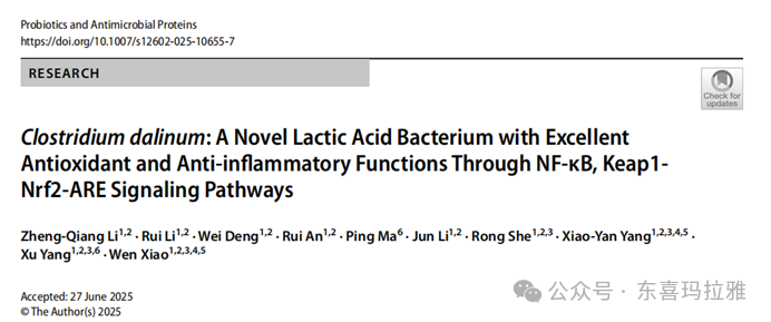乳酸菌新星—大理梭菌(Clostridium dalinum),来自云南大理的“功能益生菌王者”! 发表评论 / 学术交流 / 作者: dongxi 东喜马拉雅 最近,大理大学交叉科学中心天然抗氧化剂与抗氧化炎症研究院杨晓燕教授团队从云南大理挖掘到一株乳酸菌新种——大理梭菌(Clostridium dalinum)。这位“功能菌王者”来头不小,它不仅会快速发酵牛奶、高效凝乳、耐酸耐胆盐,还能抗氧化抗炎,效果比维生素C还要略胜一筹!该研究已于2025年7月发表在JCR一区期刊《Probiotics and Antimicrobial Proteins》上。 “原来益生菌也可以这么卷!”一场从泥土到细胞的“功能益生菌修仙之旅”。 大理梭菌可不是一株“野路子”菌,它:Ø 出生地:云南大理苍山果园的土壤;Ø 出身背景:乳酸菌家族新成员,已获批中国国家发明专利(CN117417847);Ø 抗逆天赋:不仅能挺过pH 3.0的“胃酸地狱”,也能在3%高浓度牛胆盐中笑傲江湖;Ø 特长技能:4小时发酵凝乳,所得酸奶奶味十足、口感丝滑,表现堪比“酸奶界打工皇帝”。 团队以此菌制成的酸奶产品命名为Dongxi Yogurt(东喜酸奶),研究团队成员三年的自我试饮,全员反馈“身体状态被点亮”。 大理梭菌发酵制备的东喜酸奶正经科研来了!一整套打分系统,全面验证它的硬实力。在Caco-2肠上皮细胞模型中,大理梭菌及其发酵酸奶展现出惊艳表现:ü 减轻氧化损伤:ROS、MDA、8-OHdG指标全面下降;ü 抑制炎症火苗:NF-κB、TNF-α、IL-1β水平显著降低;ü 激活抗氧能量站:Nrf2、SOD、HO-1、GSH显著上调;ü 与维生素C相比,大理梭菌的抗氧化、抗炎效果更甚一筹,比VC还强!!! 大理梭菌(C.dalinum)和东喜酸奶(D-yogurt)的抗氧化应激和抗炎效果。A:ROS(氧自由基);B:8-OHdG(8-羟基脱氧鸟苷);C:MDA(丙二醛);D:NF-κB(核因子κB);E:TNF-α(肿瘤坏死因子α);F:IL-1β(白细胞介素1β)拿下代谢组学的毕业大礼包:功能通路激活!本研究还进行了非靶向代谢组学分析,发现大理梭菌能激活一系列关键通路,包括:ü 丁酸代谢通路:有助于维持肠道屏障、抗炎症;ü 嘌呤代谢下调:意味着可能有缓解高尿酸/痛风潜力;ü 上调天然抗氧因子:Chavicol、Procaine、6-Phosphogluconic acid等关键代谢物暴涨。这些变化不仅验证了细胞实验的结果,还为大理梭菌提供了代谢机制的“身份证”,科研界的“硬通货”。 东喜酸奶保护下细胞的代谢谱变化本项目由大理州基础科研专项资助,大理大学交叉科学中心天然抗氧化与抗炎研究院牵头完成。目前,研究团队正进一步开展系统的动物实验与产业化应用研究,致力于让这款“功能益生菌王者”不仅在实验室中绽放光芒,更能够真正走向市场、服务人类健康。未来,它有望成为守护大众健康的可靠力量,成为中国人自主研发的健康守护者,为全民大健康事业注入新的活力。原文DOI:10.1007/s12602-025-10655-7 期待您的关注! 公众号撰稿 | 李政强审校 | 佘容、杨晓燕排版 | 张紫健
