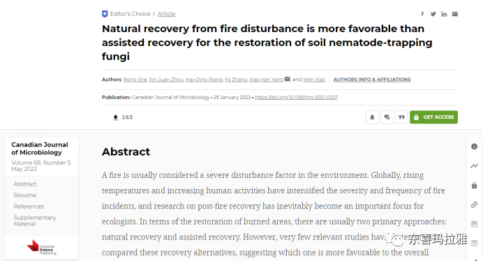 东喜玛拉雅研究院佘容副研究员在Canadian journal of microbiology上发表题为:《Natural Recovery from Fire Disturbance is More Favorable than Assisted Recovery for the Restoration of Soil Nematode-trapping Fungi》