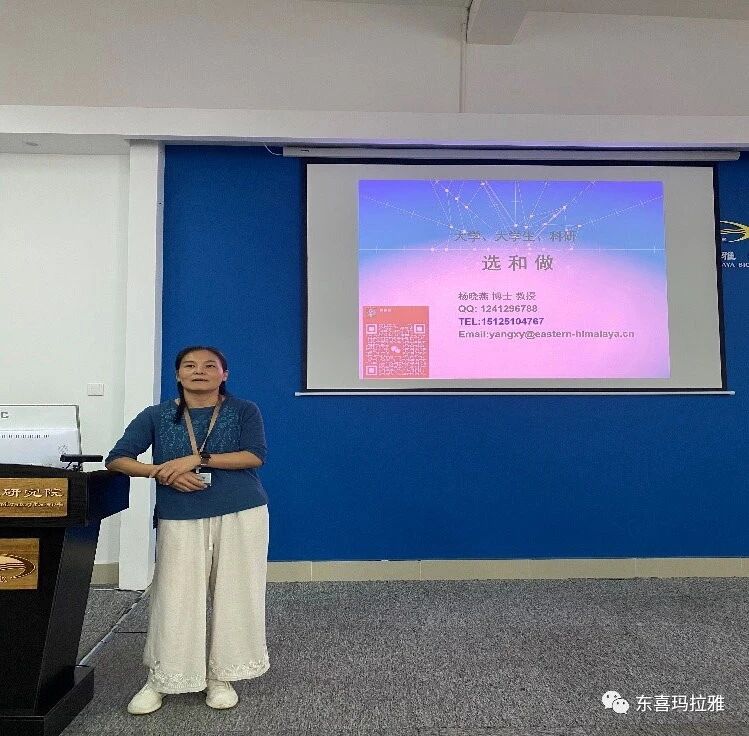 讲座首先以东喜玛拉雅研究院的创建与杨老师的教育经历展开,她指出“即便自己进入的不是理想中的大学与专业,但只要肯努力,专业与大学就限制不了你的未来”。在介绍大学四大功能即人才培养、科学研究、社会服务和文化传承与创新的同时,解析大学里的学科和专业的分类,以国立西南联合大学为例,强调科研之于大学的重要性,再分析大学与技校的人才培养目标的不同和大学人才培养的几个层级。在此基础上,结合我国目前大学本科、硕士及博士研究生招生人数和就业情况,联系许多大学生无知、迷茫和躺平的学习状态,让在座新同学清楚大家面对的现实和可能的未来。由此,杨老师为同学明确大学期间同学们需要完成的学习目标和掌握的技能。