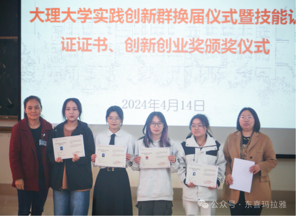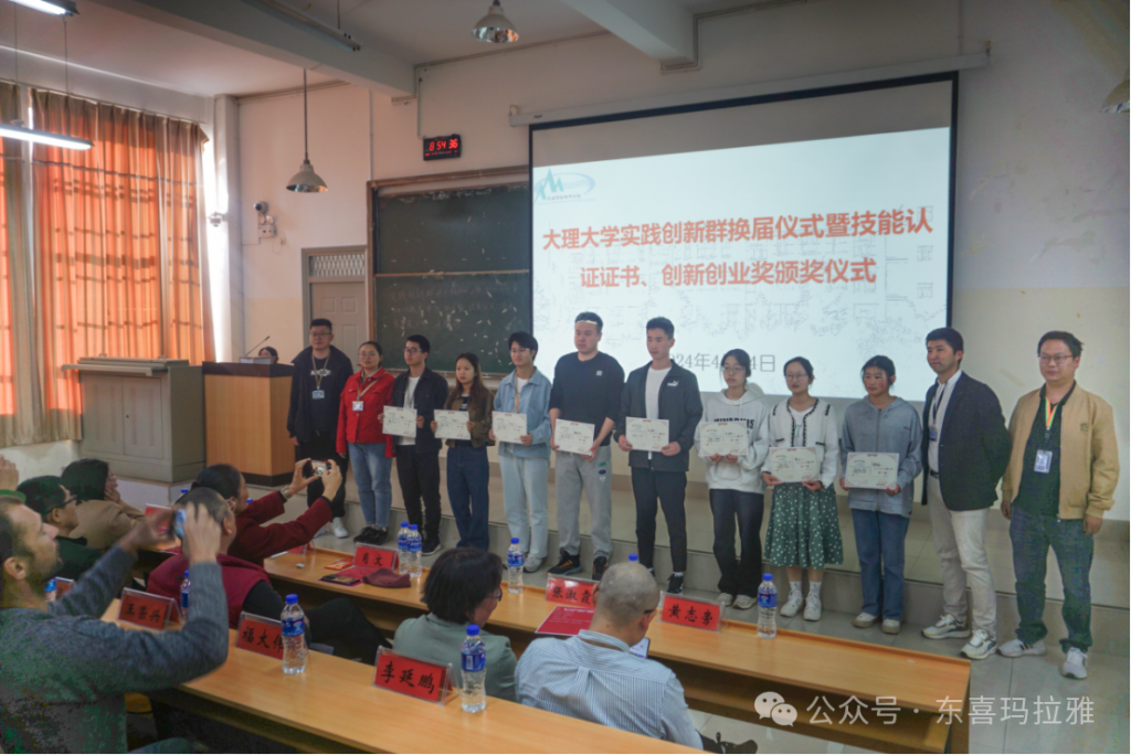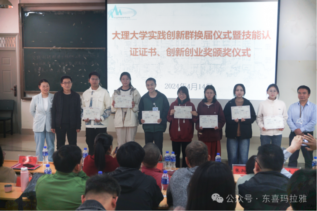 大理大学实践创新群换届仪式暨第十五届创新创业奖颁奖典礼圆满结束 发表评论 / 新闻中心 / 作者: dongxi 2024年4月14日上午8:30,大理大学实践创新群换届仪式暨第十五届创新创业奖颁奖典礼在S3-F01举行,同时在腾讯会议直播。参加本次换届及颁奖典礼的有实践创新群全体师生以及部分学生家长。工作总结及换届仪式 前实践创新协会会长、大理大学观鸟协会会长、 校园河湖长协会会长雷银 典礼首先进行实创学生及老师的工作总结和换届仪式。实践创新协会会长雷银和副会长刘子畅对过去一年的工作做出总结,实创管理委员会沐远老师指出过去一年老师、学生及实创整体存在问题进行了点评,总结了实践创新群过去一年的工作,并提出新的展望。而后实践创新群会长徐世柳宣布新的管理任职通知。新上任的实践创新协会会长徐世柳、大学生科技协会会长罗朝洋、大理大学观鸟协会会长刘子畅和校园河湖长协会会长兼外联队长杨雯婷、宣传大队队长皮宇琦,创新创业大队队长韩梦阳作出未来工作计划和展望。实践创新协会会长 实践创新协会会长 徐世柳 大学生科技协会会长 大学生科技协会会长 罗朝洋 大理大学观鸟协会会长 大理大学观鸟协会会长 刘子畅 校园河湖长协会会长兼外联队长 校园河湖长协会会长兼外联队长 杨雯婷 宣传大队队长 宣传大队队长 皮宇琦 创新创业大队队长 创新创业大队队长 韩梦阳 创新创业奖颁奖典礼接下来的创新创业奖颁奖典礼上,张淑霞老师、肖文老师、黄志旁老师、吕跃军老师、李先福老师、李娜老师、张彩彩老师、福大伟老师、李德品老师、谭坤老师、李延鹏老师、沐远老师、龚佑静老师为获得创新创业奖的同学颁奖。本科生代表饶婷婷和研究生代表李军杰发表获奖感言,提到要“守一处和,以得始终”,坚持践行 “笃、慎、博、达”,不忘初心,砥砺前行。 守一 一等奖颁发 守一 二等奖颁发 守一 三等奖颁发 守一 特等奖颁发 守一 拔尖奖颁发 获奖学生代表发言 技能证书颁发 技能证书颁发 撰稿 | 胡怡琴摄影 | 章潘琪 陈行审校 | 谭 坤排版 | 周宇涵