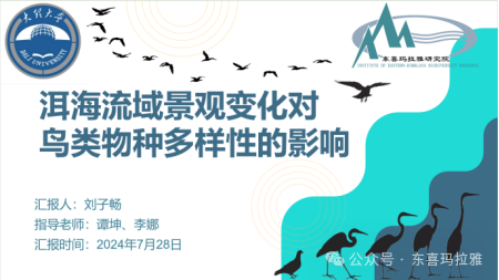 首先,刘子畅带来《洱海流域景观组成对鸟类物种多样性的影响》的报告,在洱海流域这样一个城市化与鸟类活动高度耦合的地区,探究城市化进程中景观组成的变化如何影响鸟类物种多样性,并为实现经济与生态的协调发展提出建议。