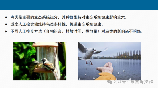 接下来,曾家碧带来了《基于人工投食探究鸟类觅食行为及偏好》的报告,结果表明投喂食物的种类会影响鸟类的数量,投喂食物越丰富,鸟类的取食数量越多、取食时长越长,黄粉虫是投喂的食物中被鸟类取食频率最高的一种。