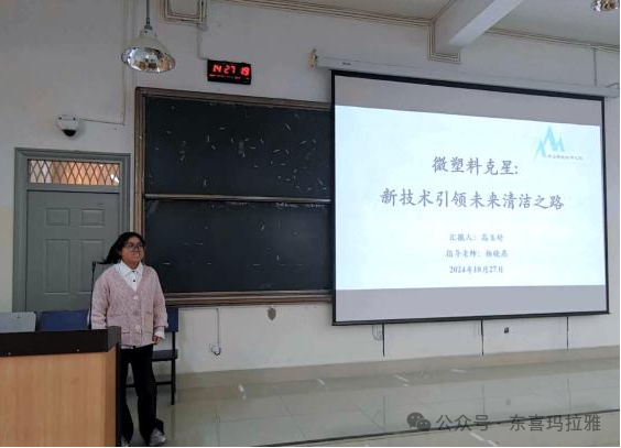 随后,高玉婷进行了题为《微塑料:新技术研究未来清洁之路》的汇报,强调了生活中微塑料及其对人体的危害,并呼吁采取措施降解微塑料,最后介绍了自己团队的相关实验,邀请大家共同解决这一问题。