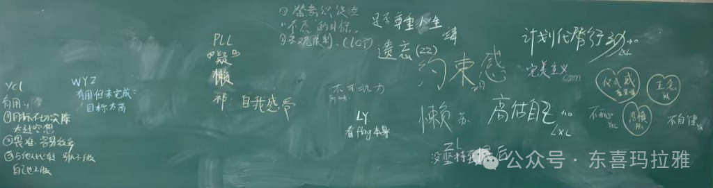 在讨论中,李先福老师也分享了自己的Flag和追求目标的经历。强调了立Flag对成长和事业发展的重要性。面对挑战,虽可能未完成Flag,但应反思和调整自己的方法和策略。随后,大家针对“为什么Flag会完不成”的原因展开讨论,并记录在黑板上,发现多数可通过个人努力和调整来克服,意识到完成Flag的关键在于自身的态度和行动。在李娜老师的引导下,大家反思立Flag的过程认识到它不仅是一个简单的目标设定,更是一个系统的过程,需要明确目标、制定计划、付诸实践,并持续调整和优化。