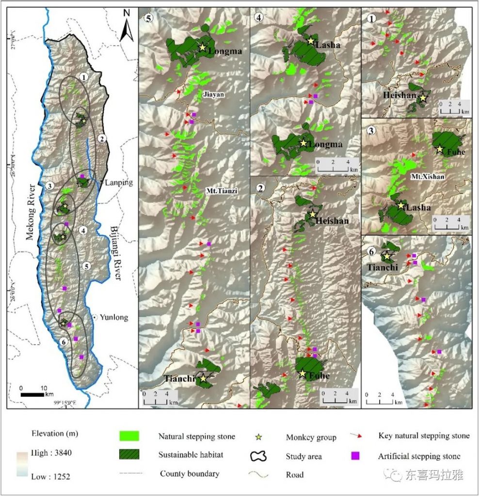 基于踏脚石思路,大理大学东喜玛拉雅研究院团队以三江并流区珍稀濒危旗舰物种滇金丝猴为对象,构建适用于山地区濒危动物栖息地破碎化的廊道和生境保护和恢复的踏脚石模式。该研究以破碎化最严重的滇金丝猴南部种群栖息地为研究区域。研究团队使用R软件解译地表景观和并进行实地调查校正,评估了滇金丝猴南部种群的栖息地现状,确定了该区域共有6个可以维持最小可存活种群长期生存的可持生境大斑块,340个可以维持个体迁移短期需要的破碎生境小斑块,5条阻碍滇金丝猴迁移的道路。