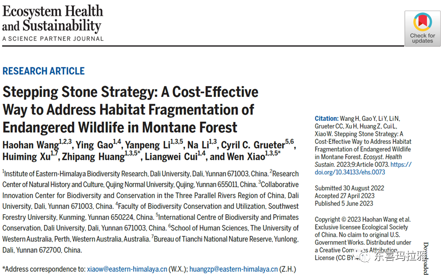 本研究成果于2023年6月以“Stepping Stone Strategy: A Cost-Effective Way to Address Habitat Fragmentation of Endangered Wildlife in Montane Forest”为题发表于Ecosystem Health and Sustainability期刊,大理大学东喜玛拉雅研究院王浩瀚博士为第一作者,肖文研究员与黄志旁研究员为通讯作者,西澳大学Cyril C. Grueter教授和云龙天池国家级自然保护区徐会明工程师等为本研究共同作者。该研究获得第二次青藏高原科学考察与研究计划(STEP, #2019QZKK0402)、国家自然科学基金(32070456,31560118)和云岭滇金丝猴云南省野外科学观测研究站(202105AM070008)等项目的支持。