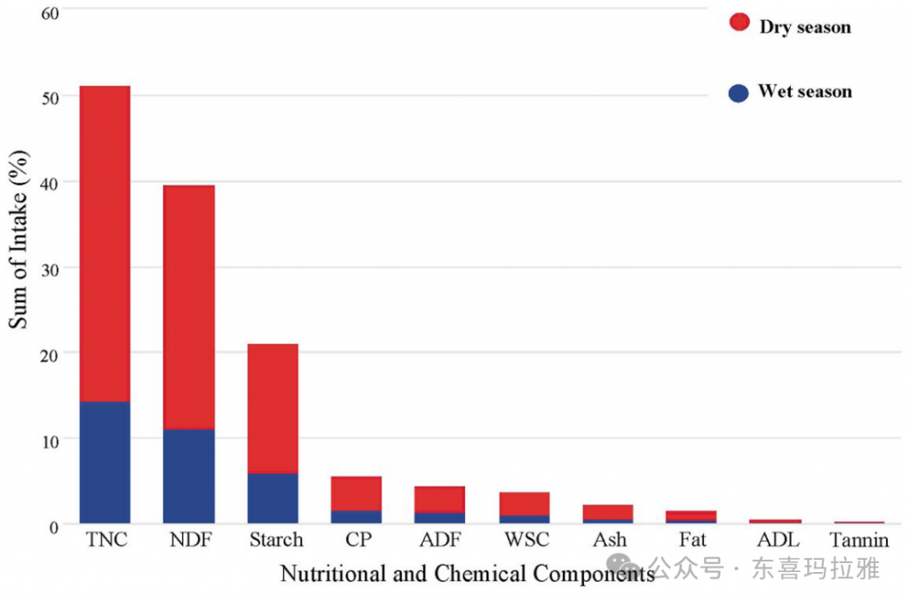 图3 滇金丝猴在旱季和雨季取食各种营养 和化学物质含量的比较