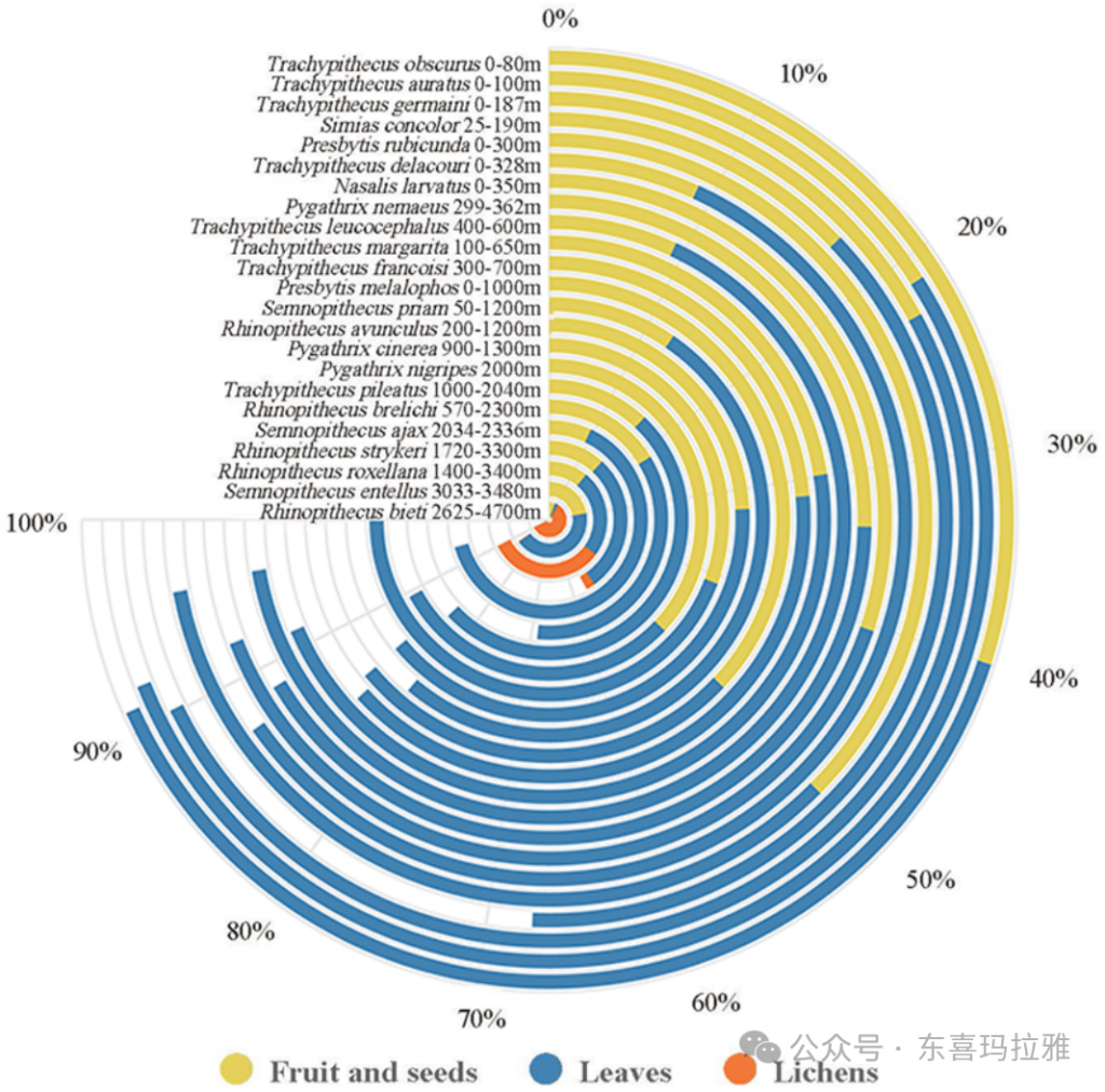 温带和寒冷地区的灵长类动物面临着严峻的挑战,受高海拔、低氧、低降雨等恶劣的环境影响,导致栖息地的植物生产力低下,季节性食物长期短缺。本以为如此艰难的环境,所有生物都会望而却步,然而滇金丝猴不但没有逃走,反而定居并在这一地区繁荣发展了起来。它们一边加强自己抗寒属性的同时一边改变祖先的觅食策略,其中就包括“后备食物”的选择。后备食物(Fallback food, FBF)是动物在特定时期因缺乏偏好的食物而选择取食的低质量食物资源。它被认为有两种类型——“Staple”和“Filler”;前者被认为是一年四季都在取食,而且某些时期的取食量可以占饮食的100%,后者从不占100%。滇金丝猴是猴科(Cercopithecidae),疣猴亚科(Colobinae)仰鼻猴属(Rhinopithecus)灵长类,其取食的松萝(主要为Bryoria spp. 和 Usnea longissima)被认为是它的后备食物。而在灵长类动物中,疣猴(Colobinae)的食物主要包括叶子、果实、花朵和种子。中新世和上新世期间,亚洲疣猴的祖先从非洲迁入亚洲后,环境选择塑造了它们的形态结构、生态适应和食性选择。它们在东亚和东南亚的分化和扩散使它们能够适应不同的环境,并在横断山和青藏高原上分布,分布垂直海拔从海岸线到海拔4000米。