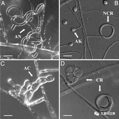 线虫会做很多坏事,比如坐享其成的寄生在老鼠、猪、人体上,破坏农民伯伯辛辛苦苦种的庄稼,甚至总是一片一片的啃松树吃,使整片森林都病恹恹的。线虫做的这些坏事往往令人咬牙切齿,头疼无比。好在自然界中存在它的克星——那就是捕食线虫真菌!捕食线虫真菌在长期和线虫斗智斗勇的过程中建立了一套极其精良的武器库,包含黏性菌网、黏性分支、黏性球、非收缩环、收缩环,遇到线虫时总能牢牢将其黏住或捉紧,将其“绳之以法”。如下图所示就是捕食器官的样子,被套住的线虫当然是跑不掉啦~